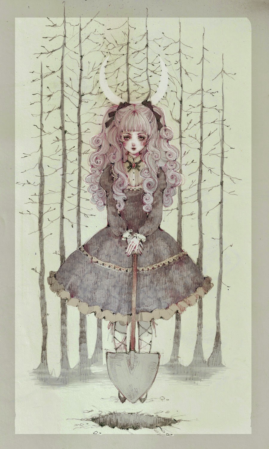 Grazie ancora! La mia tecnica preferita è l'acquarello, anche se ultimamente ho deciso di applicarmi e imparare ad usare la colorazione digitale siccome era una grande lacuna: per lo più alterno tradizionale e digitale, anche se preferisco rimanere su tinte acquarellate. Una delle prime autrici che io abbia seguito con passione è Kaori Yuki; leggevo i suoi fumetti al liceo e penso che, volente o nolente, il suo stile mi abbia influenzato molto. Non sono mai stata dell'idea che copiando pari pari il lavoro di altri autori si possa raggiungere uno stile proprio, ma se rimaniamo affascinati da un autore è naturale e bello che anche i nostri disegni ne portino in sè la traccia. Un'altra mia grande ispirazione è la moda lolita!